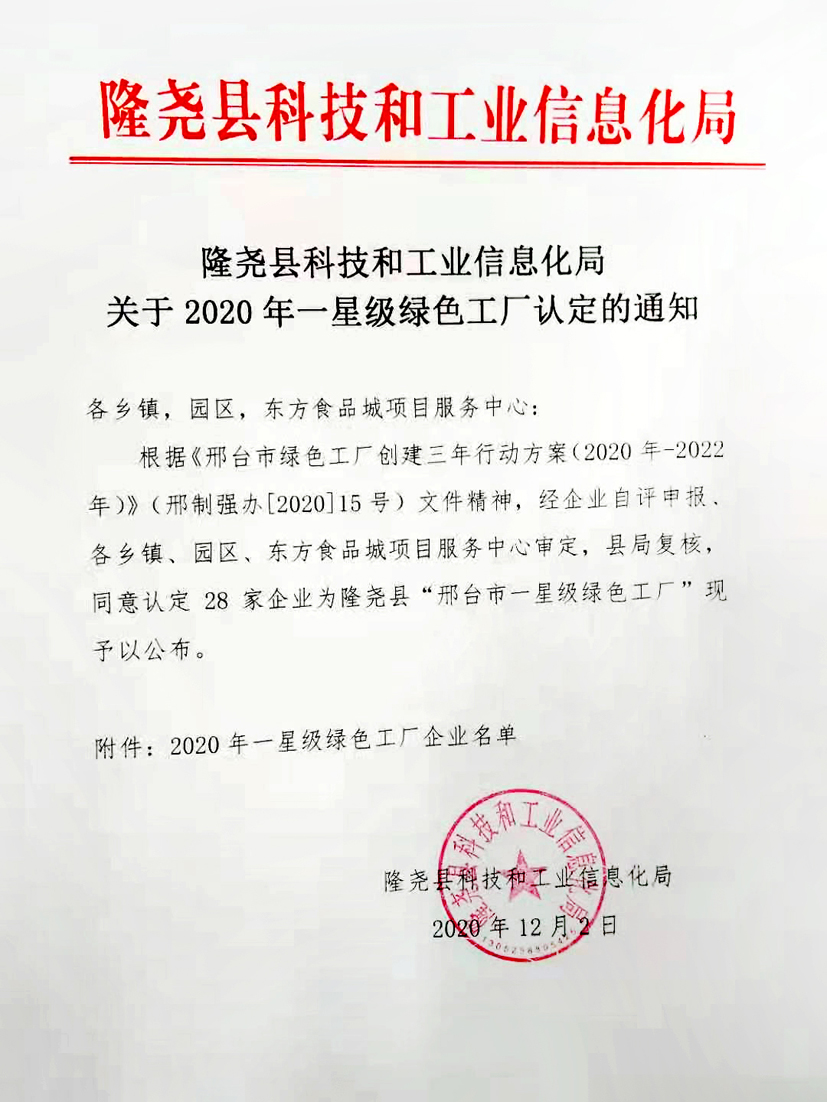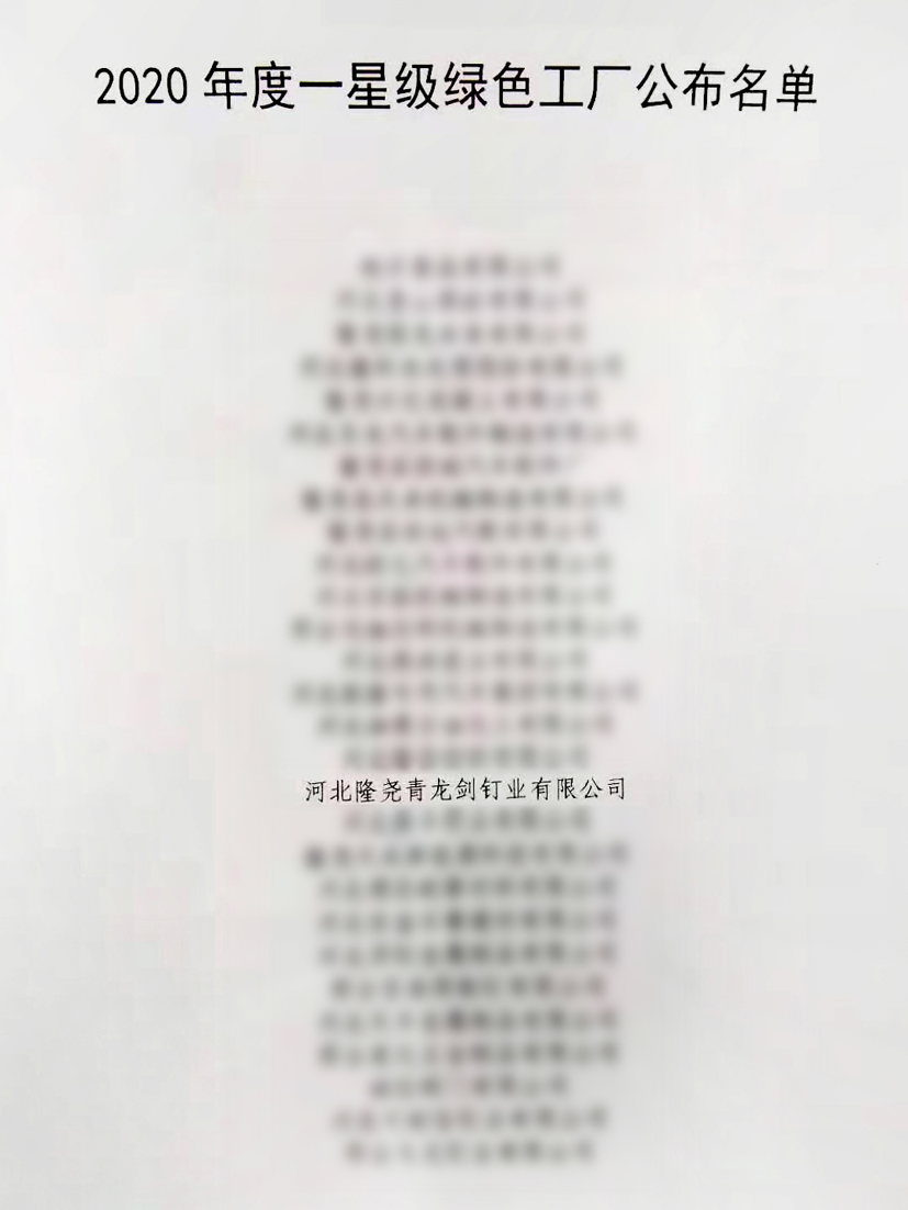 2020年12月2日,工信部印發(fā)根據(jù)《邢臺市綠色工廠創(chuàng)建三年行動方案(2020年-2022年)》(邢制強辦【2020】15號)文件精神,河北隆堯青龍劍釘業(yè)有限公司被評定為"邢臺市一星級綠色工廠"。