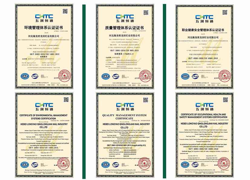 公司始終以“讓勞動創(chuàng)造更多價值”為企業(yè)理念,致力于生產(chǎn)優(yōu)質(zhì)高效的釘類產(chǎn)品。本次通過科學(xué)的管理體系和方法,不斷提升產(chǎn)品質(zhì)量與服務(wù)水平。此次公司通過了多項體系認證,標(biāo)志著青龍劍公司一直保持符合國際標(biāo)準化的管理體系要求,進一步鞏固了青龍劍在行業(yè)中的領(lǐng)先地位。