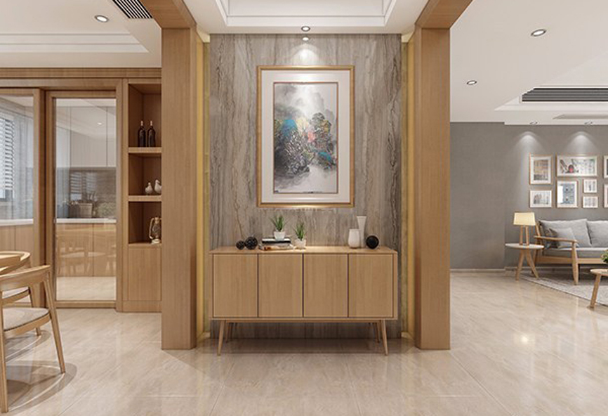 1、玄關(guān)通常與客廳或餐廳相連,但與廳的功能有區(qū)別,所以要通過裝飾設(shè)計進行功能分區(qū)。通常采用的方法主要是吊頂、墻面裝飾、地面的材料和色彩等區(qū)分或用門套、掛落、屏風、柜子等隔斷。玄關(guān)可以是一個封閉、半封閉或全開放的空間,與廳的關(guān)系是連而不直達、隔而不斷。